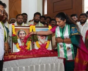 కాళోజీ జయంతి సందర్భంగా జాగృతి కార్యాలయంలో ఆయన చిత్రపటానికి కవిత నివాళులు అర్పించారు. బుధవారం చాకలి ఐలమ్మ వర్థంతి సందర్భంగాను ఆమె చిత్రపటానికి నివాళులు అర్పించి మాట్లాడారు. తెలంగాణ ప్రజలను కదలించిన కవి కాళోజీ అని అన్నారు. పుట్టుక నీది, చావు నీది బతుకంతా తెలంగాణది అని ఆయన మనలో స్ఫూర్తి నింపారని అన్నారు. కవికి మరణం ఉండదని…కాళోజీ గారు అనుసరించిన విలువలు, కవిత్వం ఇప్పటికీ ఆయనను గుర్తు చేసుకునేలా చేస్తున్నాయన్నారు. ఒక మహిళ అనుకుంటే ఏదైనా సాధించవచ్చని నిరూపించిన వీర వనిత చాకలి ఐలమ్మ అన్నారు. అలాంటి వీరత్వం తెలంగాణ రక్తంలోనే ఉందని…చాకలి ఐలమ్మ స్ఫూర్తి తో ముందుకు కదలాలని సూచించారు. సమావేశంలో ప్రముఖ కవులు, రచయితలు ఉషారాణి, డాక్టర్ కాంచనపల్లి, డాక్టర్ చమన్ సింగ్, లక్ష్మీ నారాయణ, తిరుమల శ్రీనివాస్ ఆర్య, తెలంగాణ జాగృతి ప్రధాన కార్యదర్శి నవీన్ ఆచారి తదితరులు పాల్గొన్నారు.